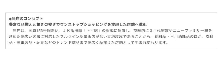 商 品 構 成:食品、生鮮(青果・鮮魚・精肉・惣菜)、酒、日用消耗品、家庭雑貨品、衣料品、化粧品、