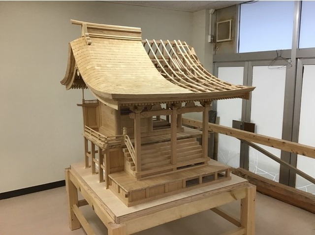 最終的には、下級生が社寺の構造を学ぶための教材として利用できるように、屋根半分や壁を造らずに各部材が見えるように仕上げました。
