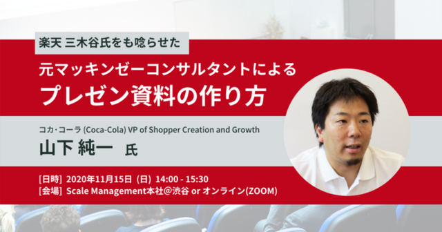 Google・コンサルティングファーム・東証一部上場など、一流企業出身の講師が支援する学生専門のビジネスサロンを展開する株式会社Scale Management(本社:東京都渋谷区、代表取締役:高師 修平)は、「楽天三木谷氏をも唸らせる。元 マッキンゼーコンサルタントによるプレゼン資料の作り方」と題し、特別イベントを開催いたします。