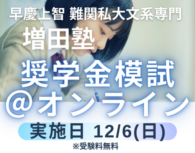 株式会社増進会ホールディングス(Z会グループ)のグループ会社で、難関私大文系専門塾「増田塾」を運営する株式会社増田塾(本社:静岡県三島市、代表取締役:下田勝昭)は、難関私大文系受験者向けの「奨学金模試@オンライン」を2020年12月6日(日)に開催します。オンラインでは初の開催です。受験料は無料で、上位50名の成績優秀者に、大学進学費用の一部を支援する奨学金を付与します。