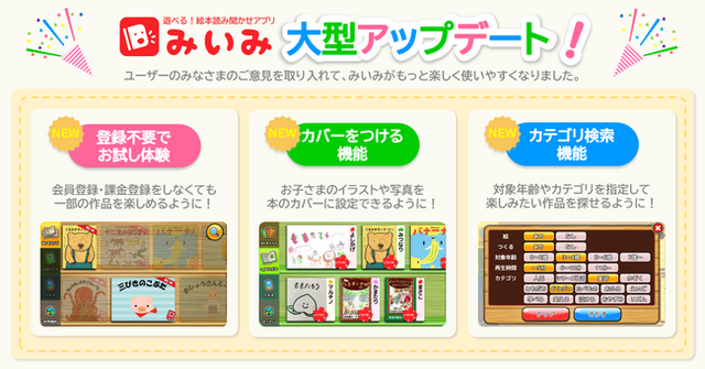 また、アカウントを登録しなくても「みいみ」の一部機能や収録作品をお試しいただけるようになりましたので、より多くのご家庭でお楽しみいただけるようになりました。ぜひ一度、親子でお試しください。