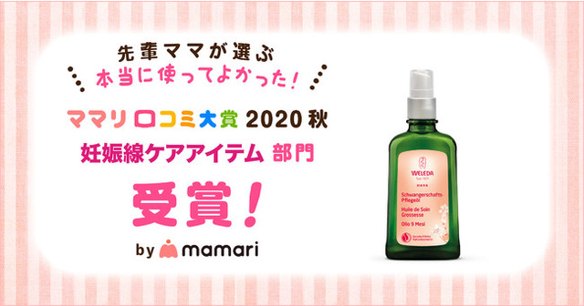 オーガニックコスメブランド「ヴェレダ」のマタニティ期のボディオイル「マザーズボディオイル」が、ママ向けNo.1(※)アプリ・情報メディア「ママリ」のママリ口コミ大賞2020 秋「妊娠線ケアアイテム部門」を、2020 春に続いて連続受賞致しました。