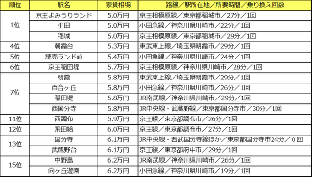 1位は同額に3駅。京王よみうりランド駅と稲城駅は京王相模原線沿線の隣駅で、どちらも快速と区間急行が停車する。駅間距離は約2kmで、どちらも閑静な住宅街だ。