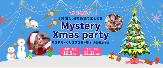 総合教育サービス事業を展開する株式会社やる気スイッチグループ(東京・中央区、代表取締役社長:高橋 直司)が新たに立ち上げた、最先端バイリンガルキッズ育成スクール「英語みらいラボ 能見台」(神奈川・横浜市)は、クリスマスシーズンの子ども向けイベントとして、「2時間たっぷりたのしめる Mystery Xmas Party(ミステリークリスマスパーティー)」を企画し、年長~小学2年生向けは12月5日(土)、小学校3年~6年向けは12月12日(土)の各日2回ずつ(10:00~12:00/13:00~15:00)開催します。