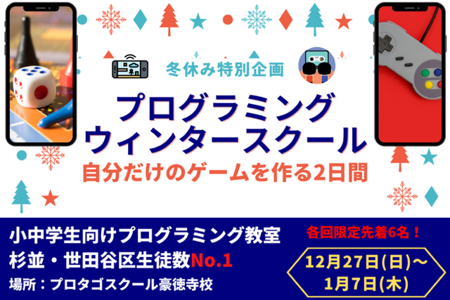 小中学生向けプログラミング教室のプロタゴスクールが、前回1週間で満員となった冬休み限定2日間でプログラミング体験ができる「プログラミングウィンタースクール」を世田谷区豪徳寺で開催します。すべてのお子さまがプログラミングの楽しさを体験できるように料金は一切かかりません。子どもたちの可能性を拡げるきっかけとなる2日間になることをお約束します!