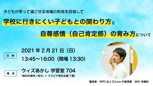 特定非営利活動法人兵庫子ども支援団体は、来年2月21日(土)に兵庫県明石市で「学校に行きにくい子どもとの関わり方や自己肯定感の育み方」についての講演会を開催します。講演会には、滋賀県で不登校児童・生徒への支援を行なっているNPO法人D.Liveの代表理事 田中 洋輔氏をお招きし、講演だけでなくワークショップも実施していただく予定です。