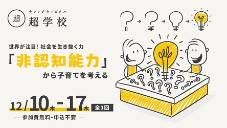 一般社団法人ナレッジキャピタル(代表理事:宮原 秀夫)、株式会社KMO(代表取締役:小田島 秀俊)は、2020年12月10日(木)、14日(月)、17日(木)の3日間、本物の知と出会い、対話するプログラムSpringX「超学校」において、「世界が注目!社会を生き抜く力『非認知能力』から子育てを考える」をオンラインで開催します。