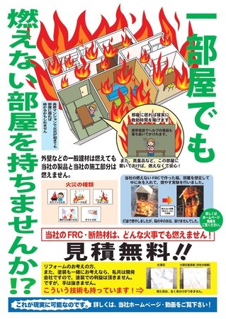 世界で初めて断熱材でISO1182不燃性試験に合格しており、1200℃の炎でも全く燃える事がない世界に類を見ない断熱材であり、有毒ガスも発生せず、熱伝導率が圧倒的に低いため、多くの方の命を守れるのではないかと考えております。また、遮音効果も高く、断熱効果も高いので、耐火リフォーム後は、快適に過ごせるお部屋としても、非常に効果的です。