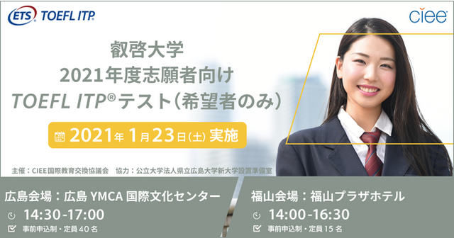 本テスト以外で実施されたTOEFL ITP(R)テストのスコアは、叡啓大学の2021年度入学者選抜の出願要件として認められません。