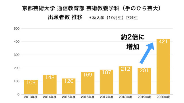 京都芸術大学(京都市左京区/学長 尾池和夫)通信教育部 芸術学部の2020年度秋入学(10月生)の出願者数が確定し、総出願者数は421名(前年 201名、209%)と、前年の出願者数の約2倍の結果となりました。