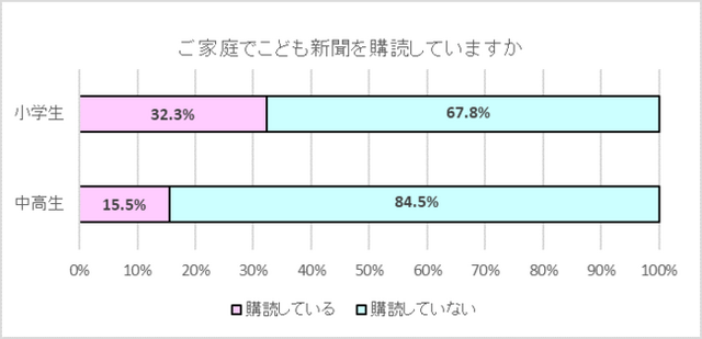 新聞(こども新聞)の購読状況を聞いたところ、小学生の家庭の32.3%、中高生の家庭の15.5%が購読していることが分かった。