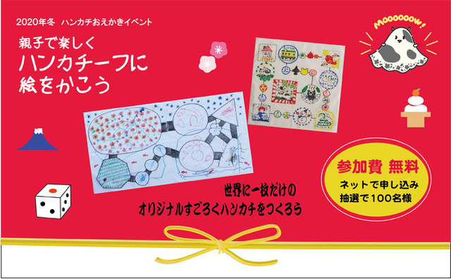 弊社では、よりたくさんの方にハンカチに親しんでいただくために啓蒙活動の一環として、毎年夏と冬に東京日本橋人形町本社で『親子で楽しくハンカチーフに絵をかこう』イベントを開催しております。今回は夏に引き続き感染症を考慮し、来場いただく東京日本橋人形町限定のイベントから、オンラインにて全国のご家庭で楽しめるスタイルにしました。11月25日(水)より申し込みを開始し、ご応募いただいた方の中から抽選で100名様にお絵描きキットをプレゼントします。