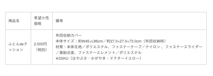 その中で弊社は新幹線デザインの布団カバー「ふとんdeクッション」を発売します。布団を巻いて入れるだけでクッションや抱き枕にもなる、新幹線デザインの布団収納カバーです。押し入れでかさばる布団がクッションに大変身、シングルの掛け布団や毛布・タオルケットが収納できます。ラインナップは三種、子どもたちに高い人気を誇る新幹線「はやぶさ」「かがやき」「ドクターイエロー」をモチーフとしています。