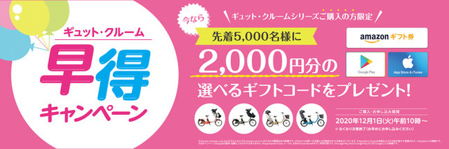 パナソニック サイクルテック株式会社は、2020年12月1日より、「ギュット・クルーム早得キャンペーン」を実施します。本キャンペーンは、子乗せ電動アシスト自転車「ギュット・クルーム」シリーズをご購入のうえ、キャンペーンサイトからご応募いただいた先着5,000名様に2,000円分の選べるギフトコードをプレゼントするものです。対象商品の「ギュット・クルーム」シリーズはパナソニック サイクルテックと取引のある全国の販売店にてご購入頂けます。