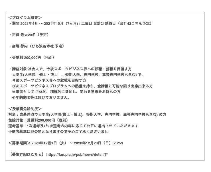 ぴあスポーツビジネスプログラム 第1期 募集要項