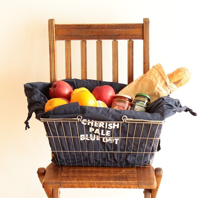 スーパーのカゴにぴったりの大容量サイズ。上部が巾着のように閉じられる仕様。