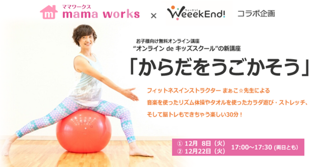 この度、12月8日(火)より、新講座『からだをうごかそう』の開講が決定しました。幼児~小学生向けのオンライン講座で大人気の「ウィーケン!」とのコラボレーション企画です。当社が運営する在宅ワーク特化型求人サイト「ママワークス」会員(登録無料)であればどなたでも参加可能です。