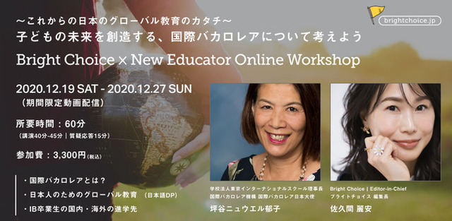 この冬休みに Bright Choice(ブライトチョイス https://brightchoice.jp/ )は、日本における国際バカロレアの第一人者、坪谷ニュウエル郁子先生と共に、子どもの教育とその後の未来について考える機会をご提供します。