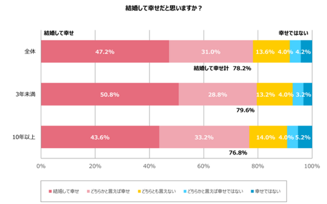 全体では「結婚して幸せ」(47.2%)、または「どちらかと言えば幸せ」(31.0%)と回答した人は78.2%でした。結婚して「3年未満」で幸せを感じている人は79.6%、「10年以上」は76.8%と「3年未満」の方が2.8ポイント幸福度が高い結果となりましたが、大きな差はみられませんでした。結婚年数にかかわらず、「結婚して幸せ」が大多数ということが分かりました。