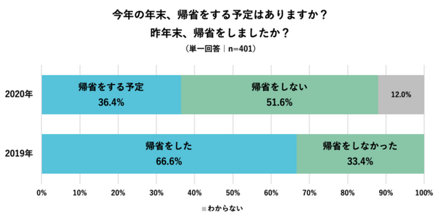 また、2019年末の帰省について聞いたところ、66.6%が実家へ帰省をしたと回答し、今年の年末帰省実施率は、昨年と比較し30.2%減少することがわかりました。