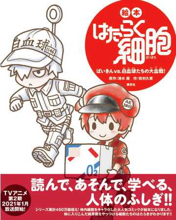 新米で方向音痴の赤血球。鋭い目つきでクールな白血球(好中球)。かわいい「仕事人」血小板……。健康を維持するために、絶えずはたらく細胞たちをキャラ化してシリーズ累計450万部超えの大人気コミックが絵本になりました!