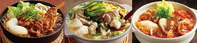 【鍋メニュー:すき焼き鍋定食、博多もつ鍋定食、あさりたっぷりコク旨バターチゲ定食】