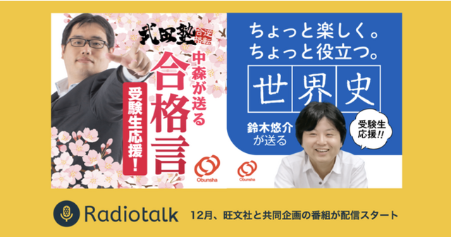 このたび配信開始する番組は、「受験生応援!武田塾中森が送る 合格言」と「受験生応援! 鈴木悠介が送る ちょっと楽しく・ちょっと役立つ世界史」の2番組です。