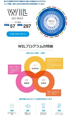 大学で展開するWILは「追大WIL(おいだいウイル)」と呼び、教育理念に基づく「社会有為」、「協働性」、「発信性」の3つの要素を満たす正課科目をWILプログラムとして登録して見える化したほか、将来的には正課外での教育的実践も、3つの要素に加え「時間」、「指導」、「記録」、「評価」という4つの条件をクリアすればWILを具現化した取り組みとしてWILプログラムに認定します。