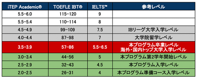 TOEFL/IELTS高得点取得により、国内トップクラス大学への進学を実現。海外高校卒業生対象の特別枠入試受験資格を認める大学もあり。