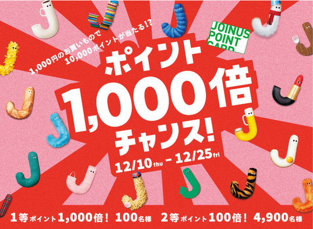 2020年12月10日(木)~25日(金)の期間中、ジョイナスでジョイナスポイントカードを提示してお買いものをした方の中から抽選で、総勢5,000名様に当選した倍率に応じたジョイナスポイントをプレゼントいたします。