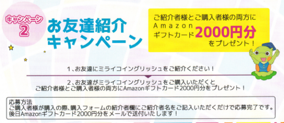 またご購入者様がご友人様をご紹介いただき、ご紹介いただいた方が「ミライコイングリッシュ」をご購入されると、ご紹介してくださった方・ご紹介頂いた方 双方にもれなくAmazonギフトカード2,000円分をプレゼントいたします。さらに今なら、ご購入者様限定で当社オリジナル ハローポーのワークブックもプレゼント致します!