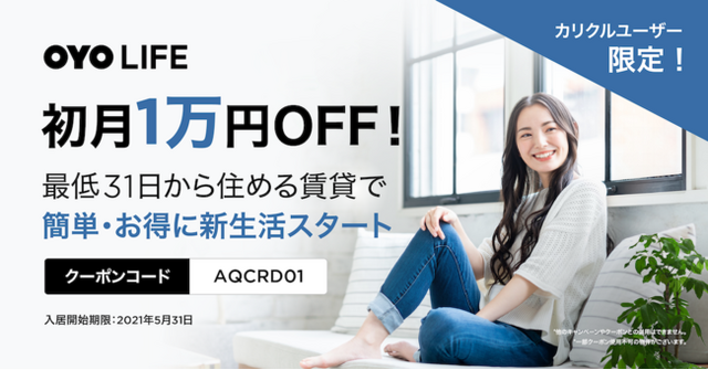 本キャンペーンを利用し「OYO LIFE」で部屋を予約後、2021年05月31日までに入居を開始すると、初月の家賃が1万円分割引となります。