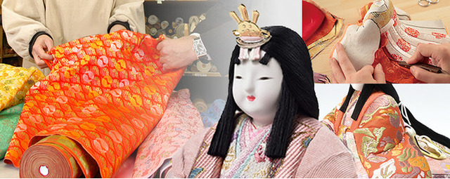 桐塑でつくられた人形に、ひとつひとつ手作業で衣裳や模様の筋彫りを入れ、 そこに目打ちなどで布地を入れ込んで(木目込み)着せ付けいく、大変手の込んだ人形です。