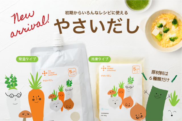 これまで「やさいだし」は、初回限定お試しセット特典としてのお届けのみでした。the kindest では日々ママさんとコミュニケーションをとっており、使い勝手の良さと、使用している原材料の野菜が有機野菜のみという安心感から、単品でも購入したいというお声を多数いただき、今回あらためて単品で販売する運びとなりました。ママパパの負担を少しでも減らし、赤ちゃんに安心して使っていただける「やさいだし」は、離乳食期の心強い味方です。