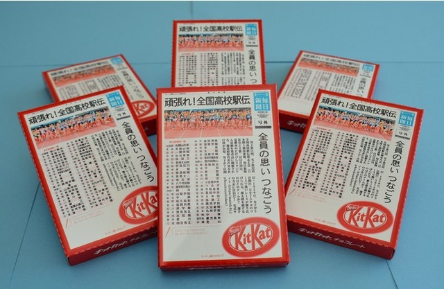 出場各校に贈られる「オリジナル キットカット」のパッケージは、出場決定を報じる毎日新聞の号外紙面(男女別)が印刷された限定の特別バージョン(非売品)です。「キットカット」に「きっと勝つ」の思いを込めて、選手や監督など、お世話になった人同士で感謝や応援の気持ちを込めて贈り合うことができるよう、メッセージ欄を設けています。