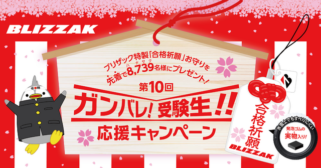 ブリヂストンタイヤソリューションジャパン株式会社は、受験生の皆様を応援するために2020年12月9日(水)より「BLIZZAK ガンバレ!受験生!!応援キャンペーン」を開催中です。キャンペーン特設サイト内で動画を視聴された方のうち、先着で8,739名様に「合格祈願」お守りをプレゼント致します。