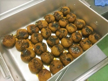 かぼちゃもちは、蒸したかぼちゃに油、塩、片栗粉を入れて混ぜたものをチーズで包んで揚げ、仕上げに黒ゴマ入りのタレをかけた料理ですが、学校給食向けに合わせた材料で作りました。