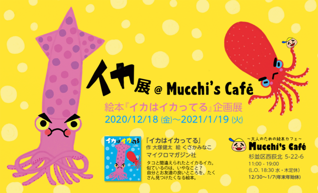 マイクロマガジン社(東京都中央区)より出版した絵本『イカはイカってる』の企画展「イカ展」を、西荻窪にある~大人のための絵本カフェ~【ムッチーズカフェ】で開催いたします。