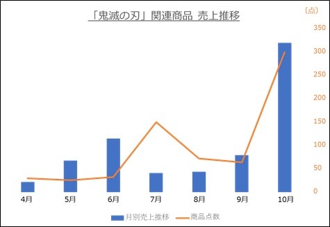 2) 「鬼滅の刃」関連商品点数は4月の約30点から10倍となる約300点、売上は約14倍に増加