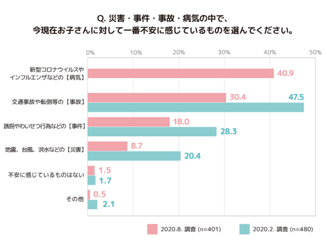 災害・事件・事故・病気の中で、ママたちが一番不安に感じているのは、「新型コロナウイルスやインフルエンザなどの病気(40.9%)」。次いで「事故(30.4%)」「事件(18.0%)」「災害(8.7%)」となりました。