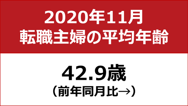 転職主婦の平均年齢は、前月比±0歳、前年同月比±0歳の42.9歳となった。