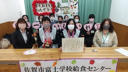 大会に出した献立は佐賀県産、富士町産の食材がふんだんに使われており、地場産の食材を多く生かして色々な味わいを感じることができる工夫がなされている点や、富士町産のお茶を使用したユニークなふりかけなどが高く評価されました。