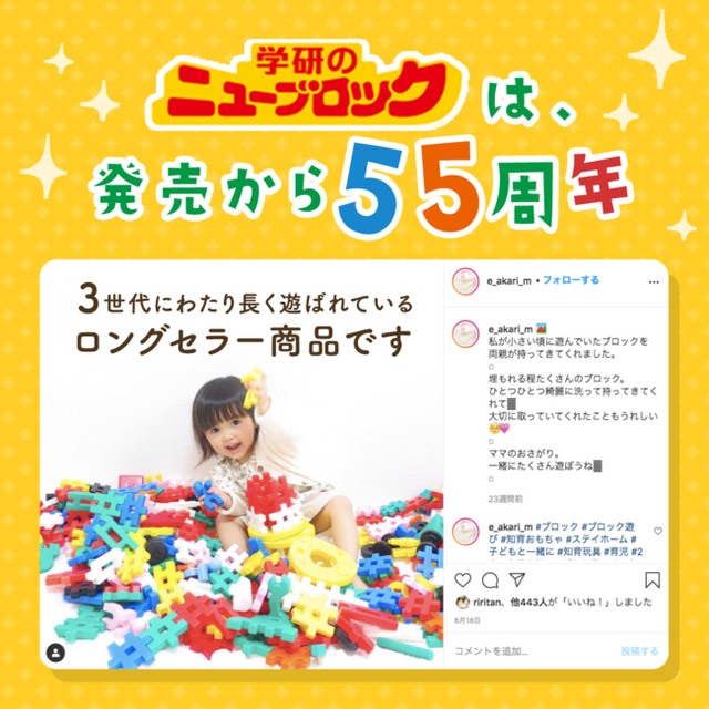 ひらめきのタネを刺激する「学研のニューブロック」は、今年で55周年。発売当初から変わらぬブロックの形で親子3世代に渡り遊ばれてきた学研のロングセラーのブロックです。お子さまのファーストブロックとして、1.5歳から遊べ、その遊び方は無限大です。自由に考えて色んな形に組み替えられるので、「創造性」を刺激して「長く遊べる」のが魅力です。