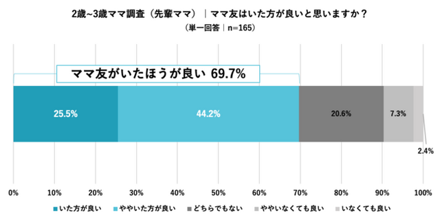 現在2歳~3歳の長子を持つママ(以下、先輩ママ)に、ママ友はいたほうが良いと思うかを聞いたところ、69.7%が「ママ友はいたほうが良い」と回答しました。