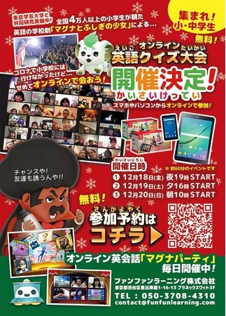 オンラインクリスマスパーティは、ファンファンラーニング株式会社が実施している人気サービスの1つ「オンライン英語クイズ」を交えたオンラインイベントです。ネイティブ英語講師とバイリンガル日本人サポーターが司会進行を行い、英語が分からなくても子供から大人までお楽しみいただけます。