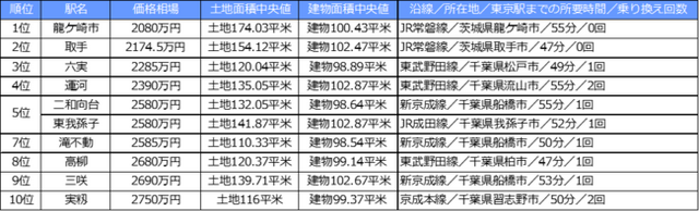 東京駅まで60分以内の価格相場が安い駅TOP10 ~中古一戸建て編~
