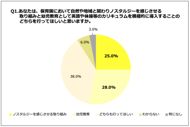 保護者が保育園に導入して欲しいものとして「幼児教育」が28.0%、「ノスタルジーを感じさせる取り組み」が25.0%