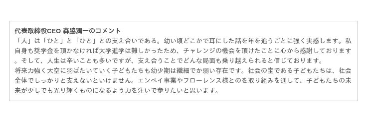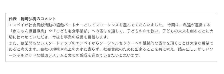 「お金の流れを円滑にし、幸せな社会を創造する」ことをビジョンに掲げ、集金業務のキャッシュレス化を実現するFintech×SaaSプラットフォーム「enpay(エンペイ)」を事業運営するエンペイと、「みんなで子どもたちを抱きしめ、子育てとともに何でも挑戦でき、いろんな家族の笑顔があふれる社会」をビジョンに掲げるフローレンスとで、社会変革のインパクトを最大化していけるよう尽力してまいります。