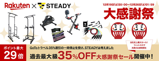 自宅用フィットネス器具ブランド「STEADY」を販売する株式会社マドゥレスは本日、旅行代金より最大35%相当の割引を受けられるGoToトラベルキャンペーンの一時停止を受け、より多くの皆様にお家時間を楽しんでもらいたいとの思いから、12月19日(土)20:00~12月26日(土)01:59にわたって楽天市場で行われる「楽天大感謝祭」にて、今月販売を開始したミニフィットネスバイクを含む人気商品を最大35%OFFにて販売する過去最大級のセールを開催することを発表しました。
