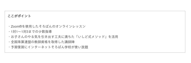 いしど式オンラインは、そろばんを「能力開発の道具」として、ただの計算道具ではなく、能力開発の教具と捉え子どもたちの力を伸ばす教育メソッドを開発。株式会社イシドが、47年にわたる対面授業で得たノウハウを惜しげもなくつぎ込んだ少数指導によるオンライン授業です。予習復習には株式会社イシドがかねてより展開している有料サービスである「インターネットそろばん学校」が使い放題になります。講師陣には全国珠算連盟の教師資格を取得した有資格者を揃えており、お子さんのやる気を引き出す工夫が組み込まれている教育サービスになっております。